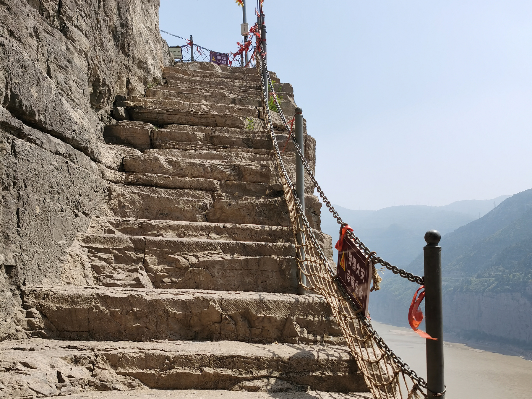 梯子崖为北魏时期军事古栈道,距今约 1600 年的历史,在黄河东岸的千仞峭壁外侧呈“之”字形盘旋而上,一弯一景致,一高一重天,从空中鸟瞰梯子崖,宛如在一块巨大的悬崖竖石上雕刻出的 365 个石台阶,堪称天下黄河第一挂壁天梯。
